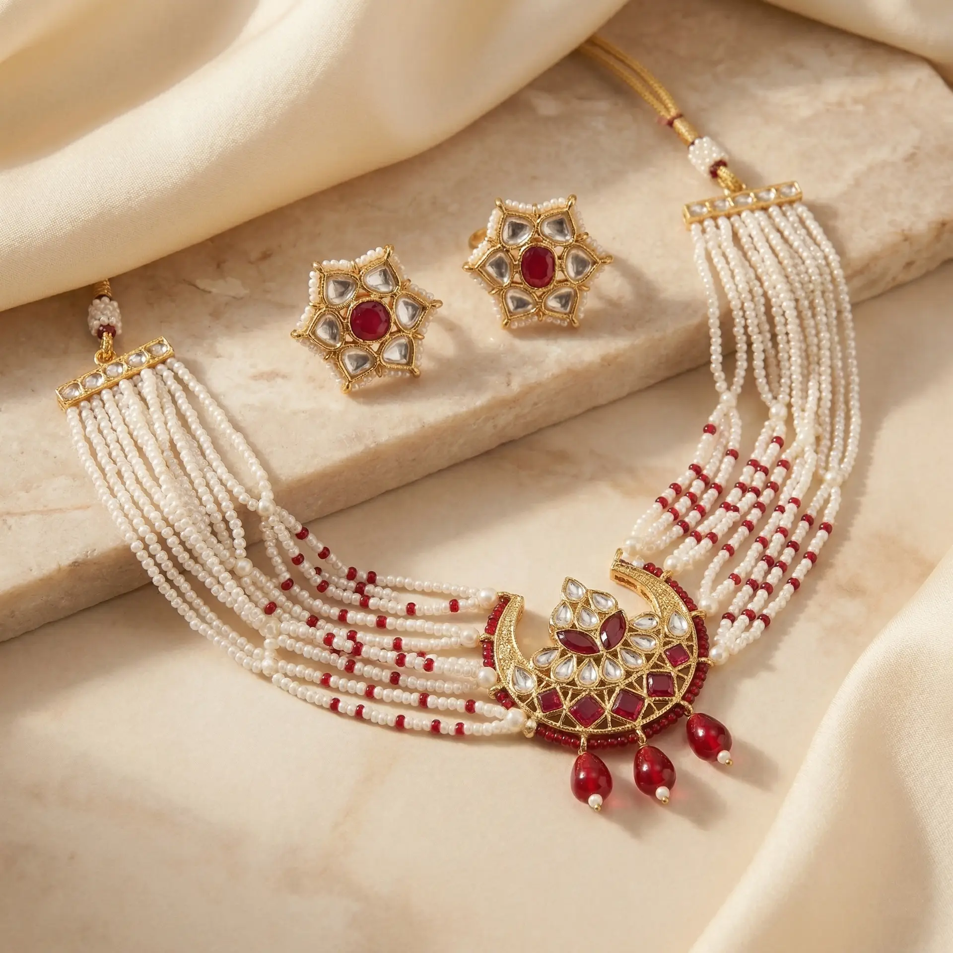 Diva Delight Multi Layer Pearl Choker Necklace Set with Red Stone Kundan Pendant & Earrings | Bridal Imitation Jewellery | Traditional Party Wear Artificial Jewellery for WomenTurn every occasion into a statement of elegance with this stunning Diva Delight Multi-Layer Pearl Choker Necklace Set.